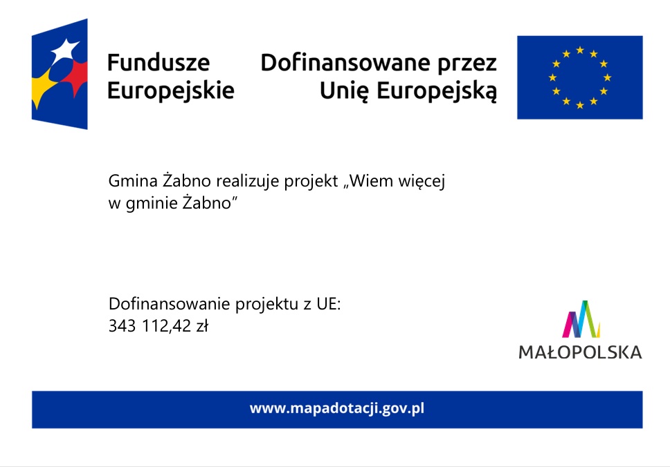 Gmina Żabno realizuje projekt pt , który jest dofinansowany w ramach programu Fundusze Europejskie dla Małopolski 2021 – 2027, Priorytet 6 Fundusze europejskie dla rynku pracy, edukacji i włączenia społecznego, Działanie 6.30 Wsparcie kształcenia ogólnego – ZIT, typ projektu: B. Podniesienie jakości kształcenia ogólnego.