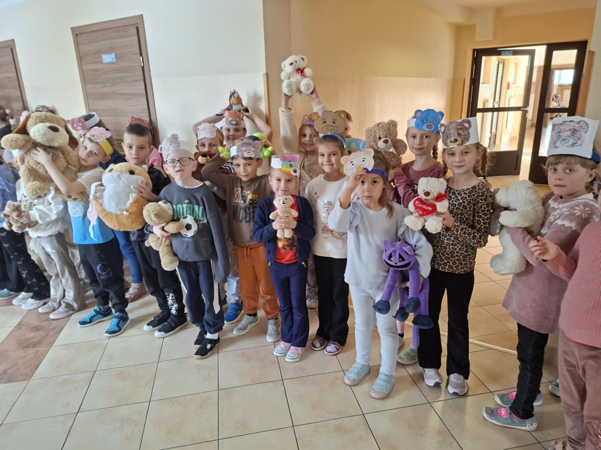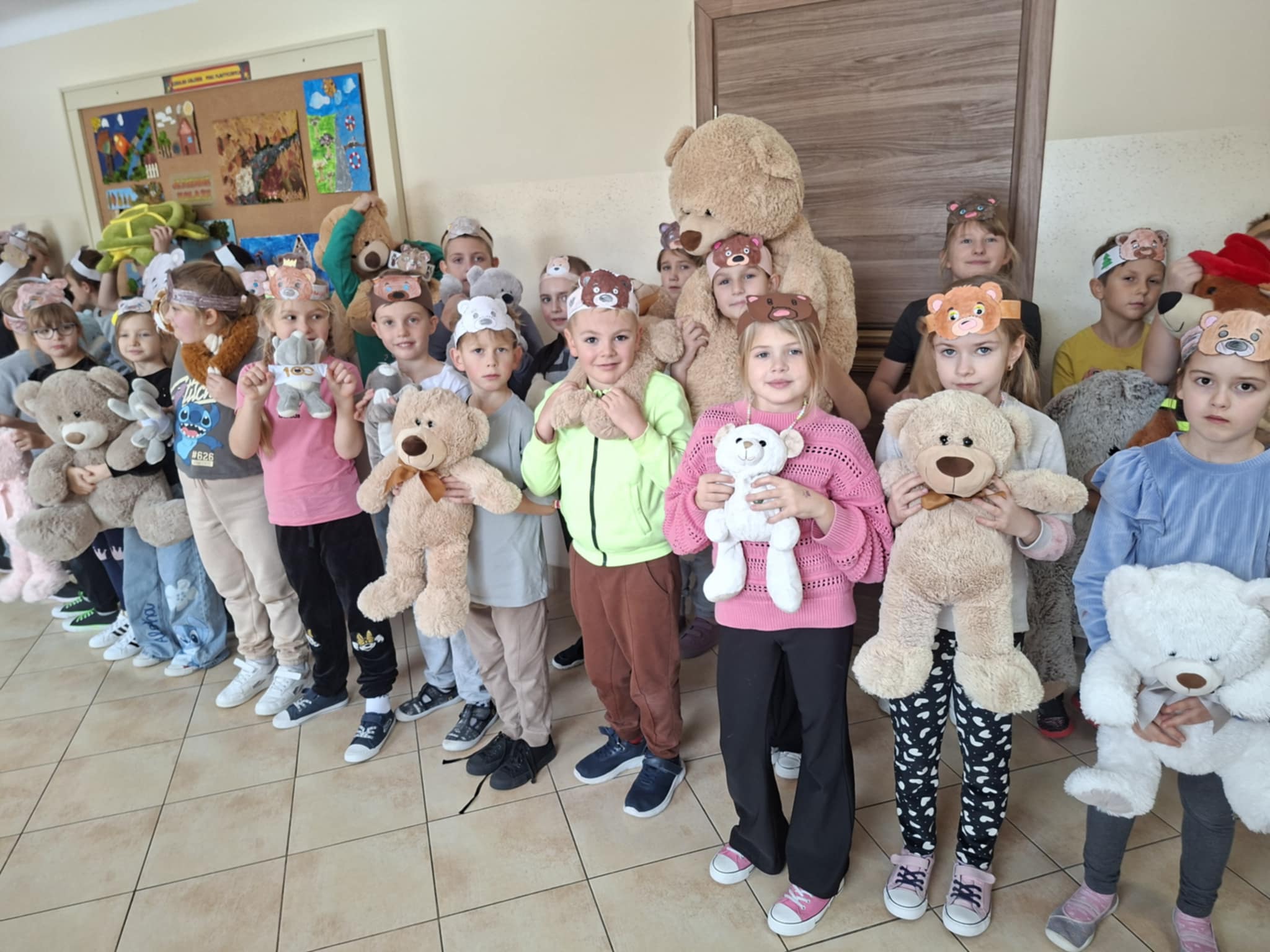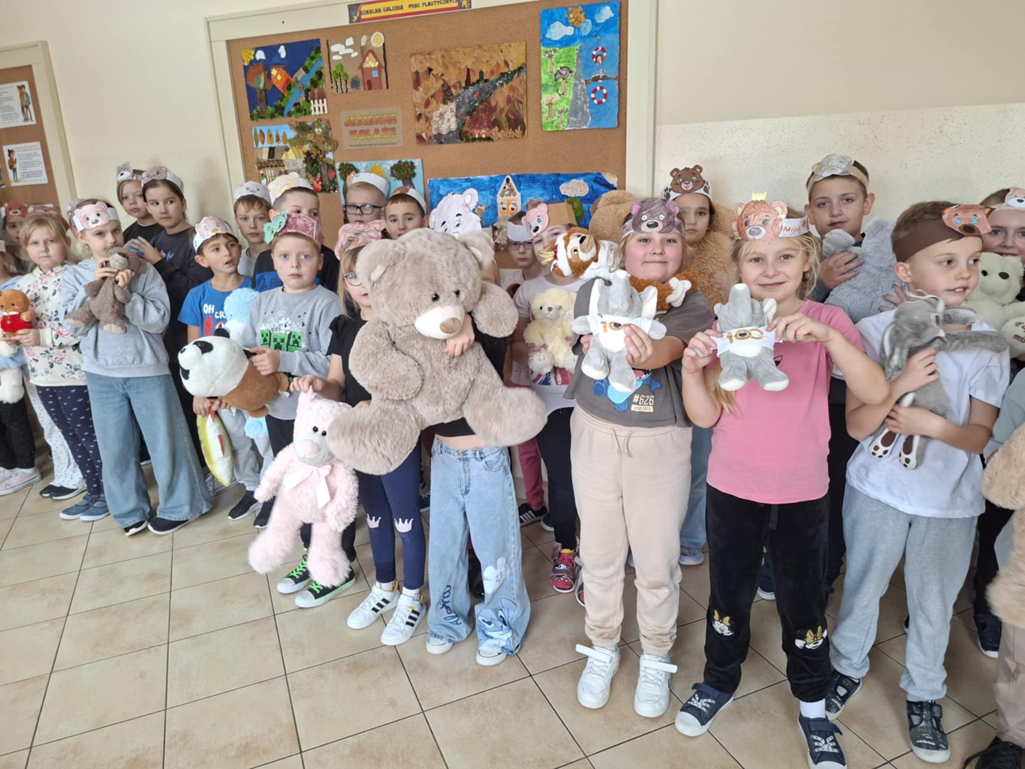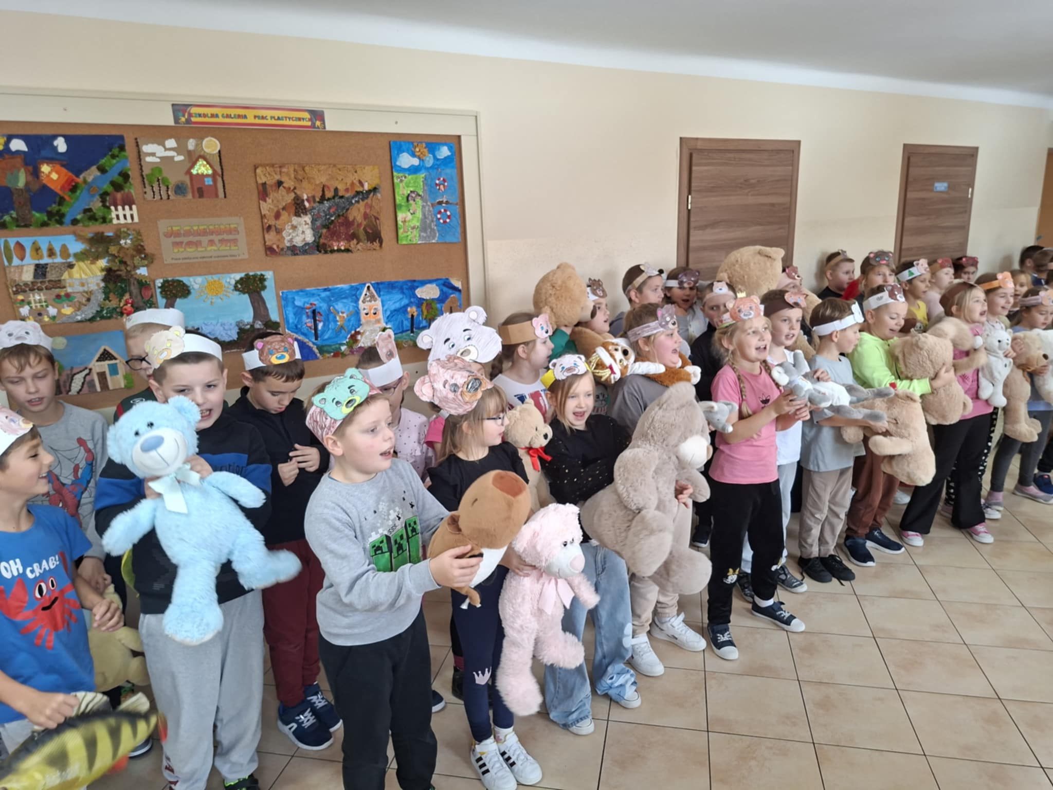 Tego szczególnego dnia uczniowie nie tylko przynieśli swoje maskotki, ale również założyli na głowy specjalne opaski, ozdobione własnoręcznie pokolorowanymi wizerunkami misiów. Dzięki temu cała społeczność szkolna mogła poczuć wyjątkowy klimat święta, a barwne opaski stały się wspaniałym akcentem podkreślającym dziecięcą kreatywność i radość.