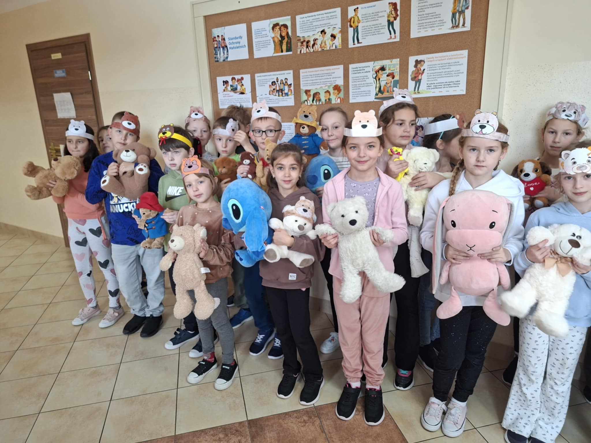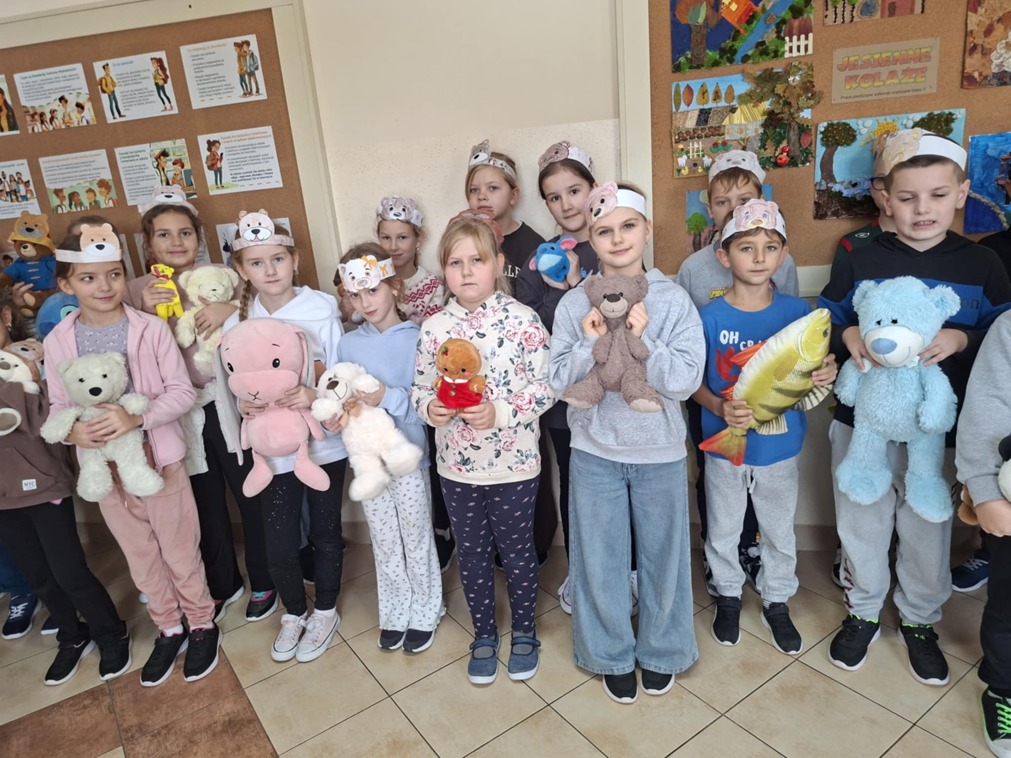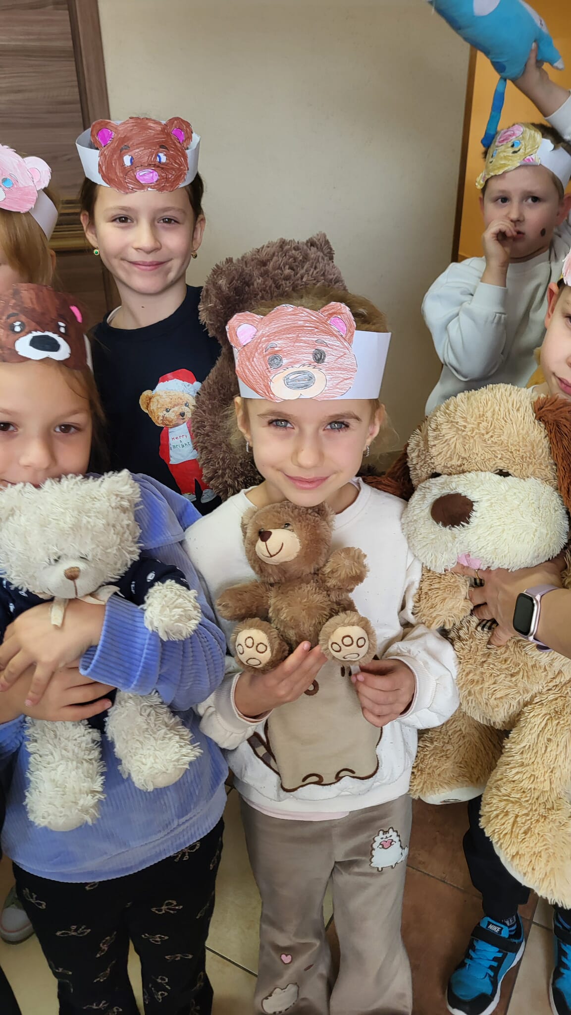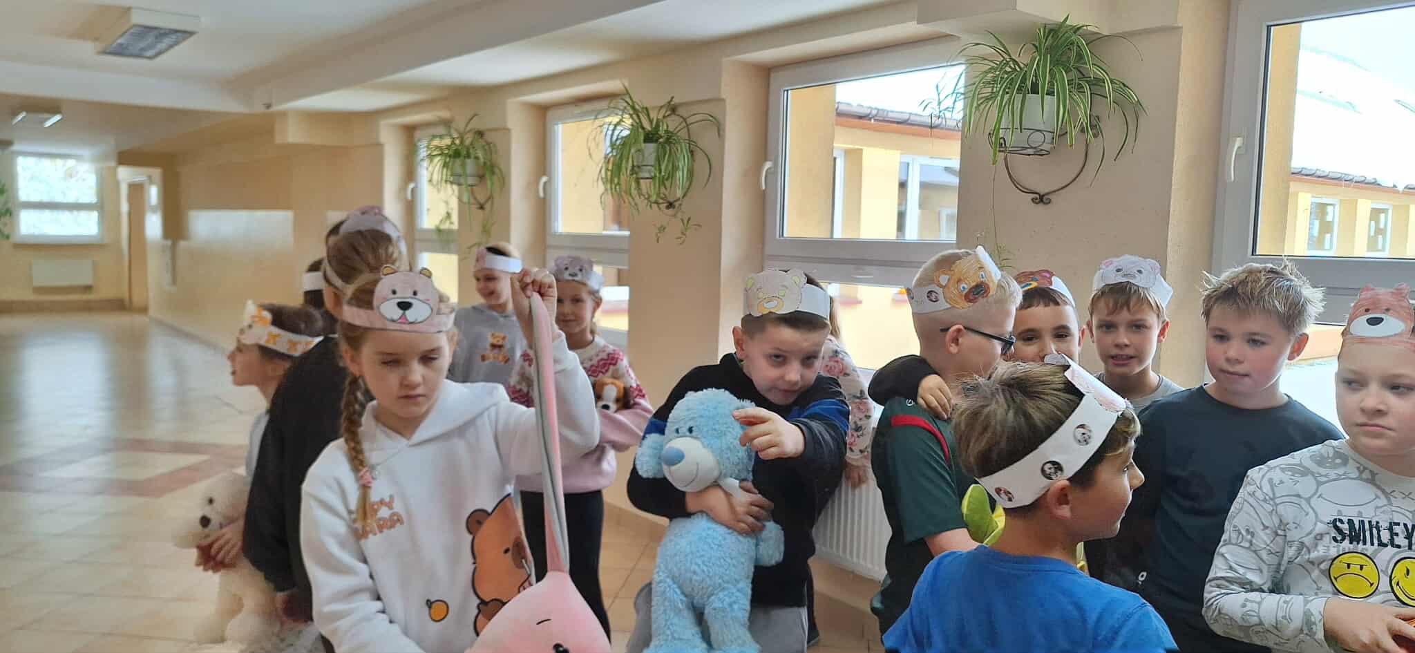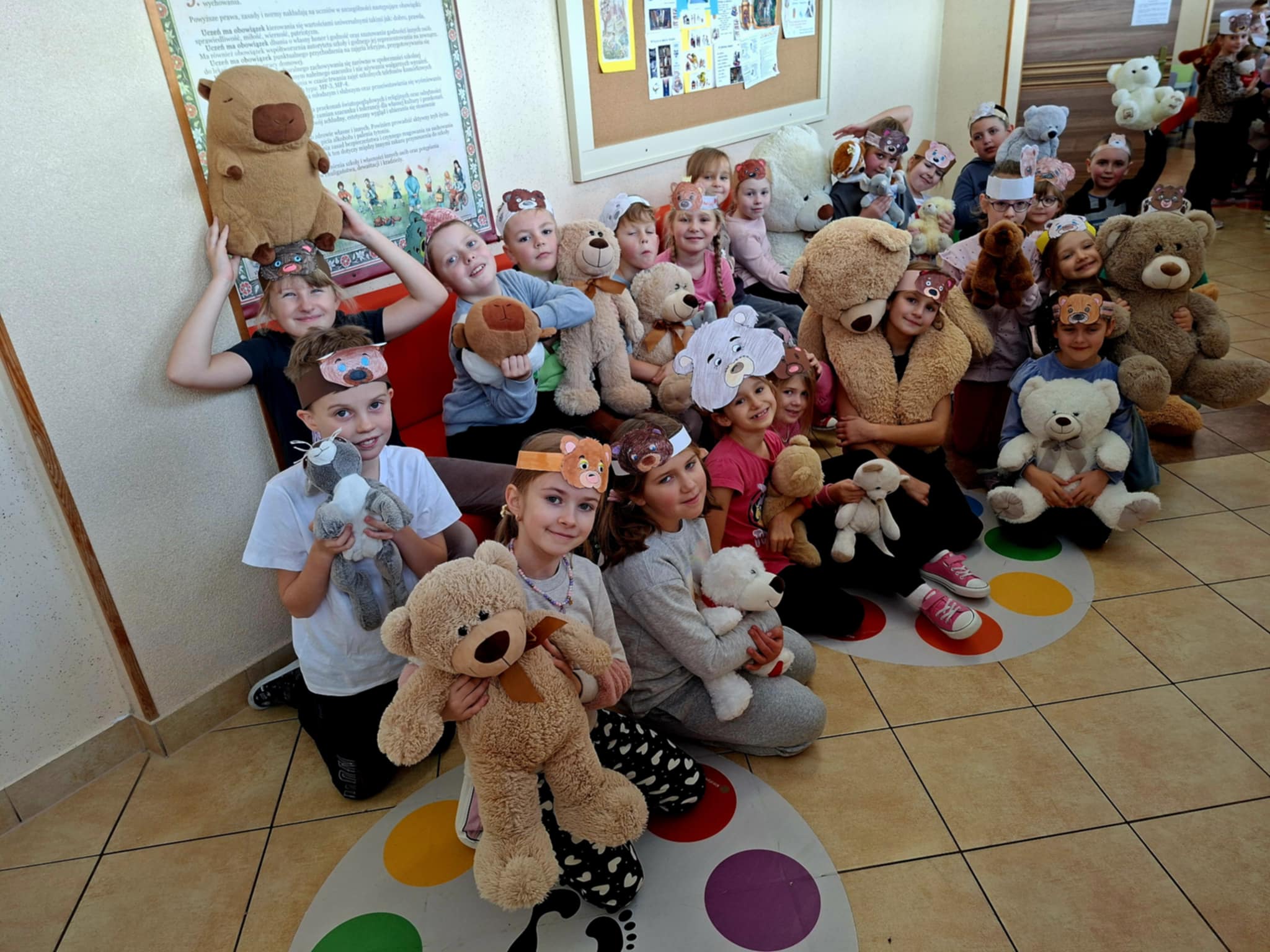 Tego szczególnego dnia uczniowie nie tylko przynieśli swoje maskotki, ale również założyli na głowy specjalne opaski, ozdobione własnoręcznie pokolorowanymi wizerunkami misiów. Dzięki temu cała społeczność szkolna mogła poczuć wyjątkowy klimat święta, a barwne opaski stały się wspaniałym akcentem podkreślającym dziecięcą kreatywność i radość.