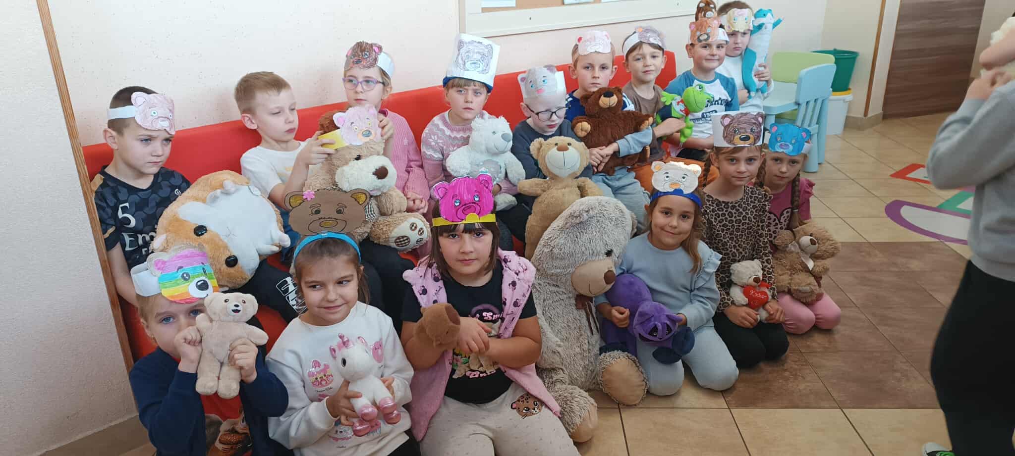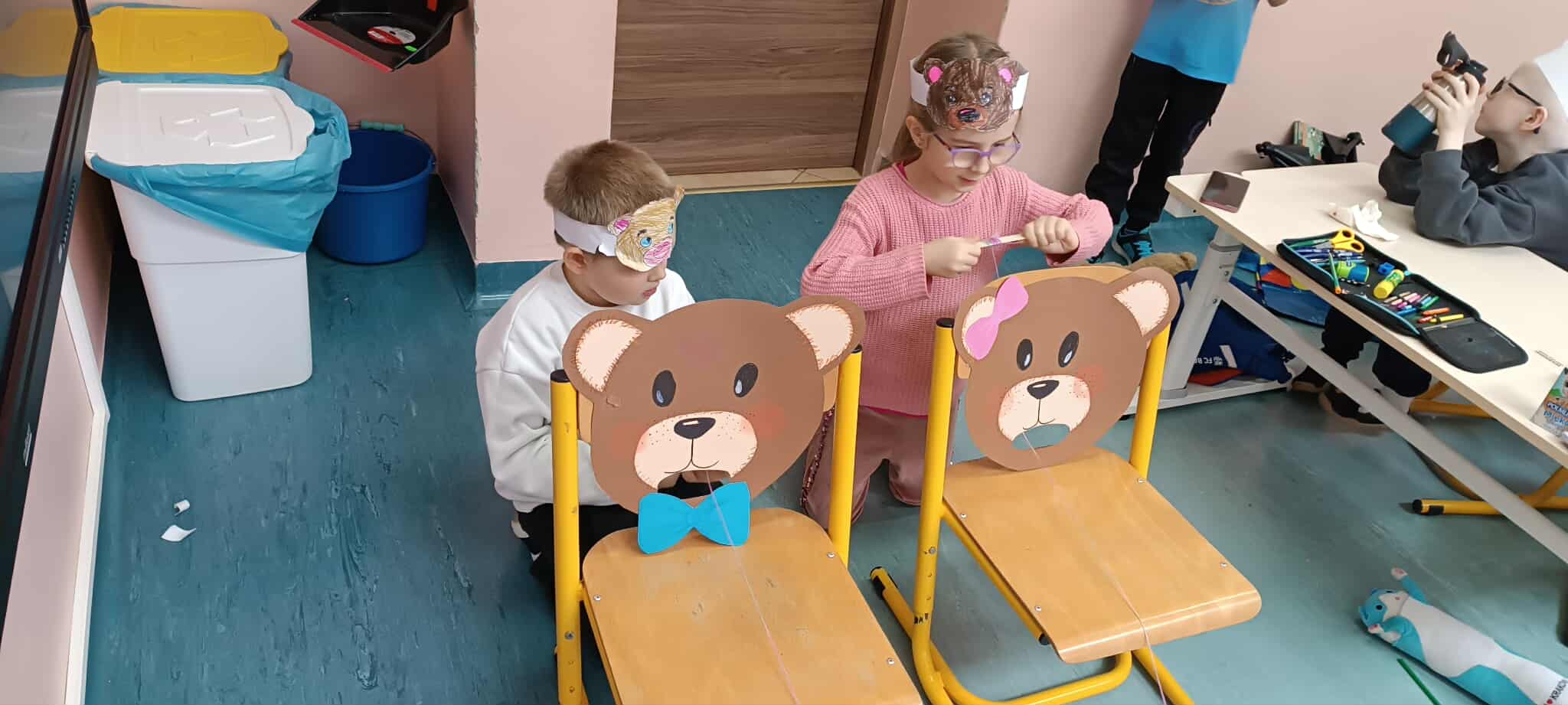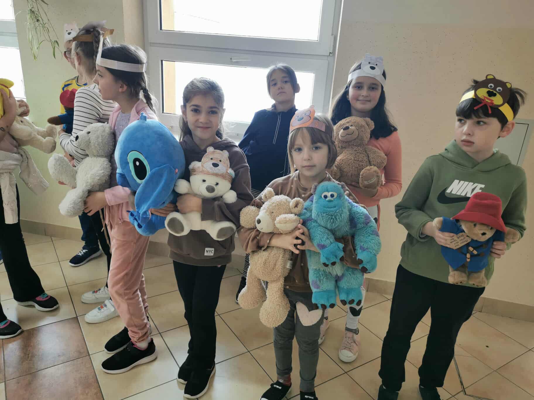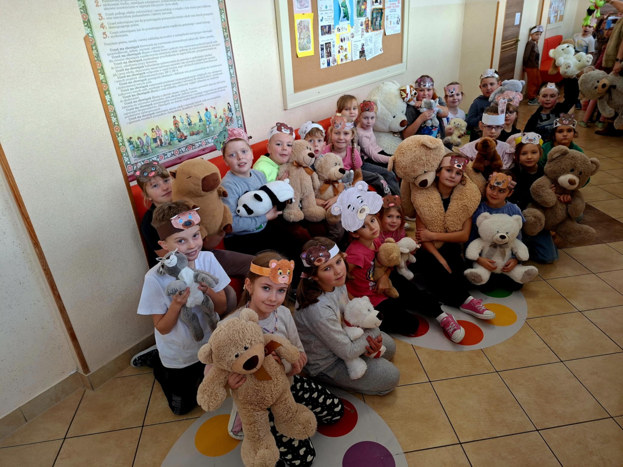 Tego szczególnego dnia uczniowie nie tylko przynieśli swoje maskotki, ale również założyli na głowy specjalne opaski, ozdobione własnoręcznie pokolorowanymi wizerunkami misiów. Dzięki temu cała społeczność szkolna mogła poczuć wyjątkowy klimat święta, a barwne opaski stały się wspaniałym akcentem podkreślającym dziecięcą kreatywność i radość.