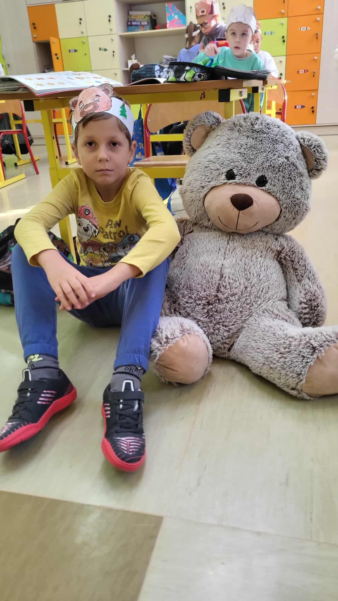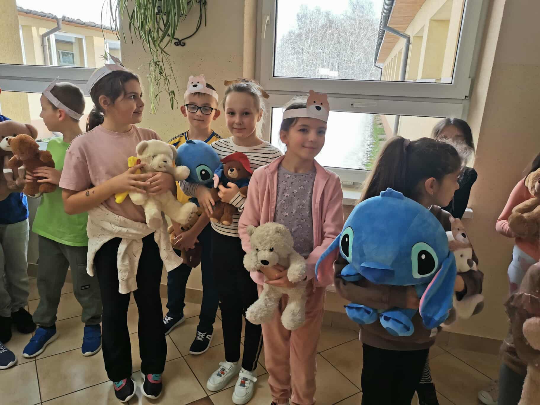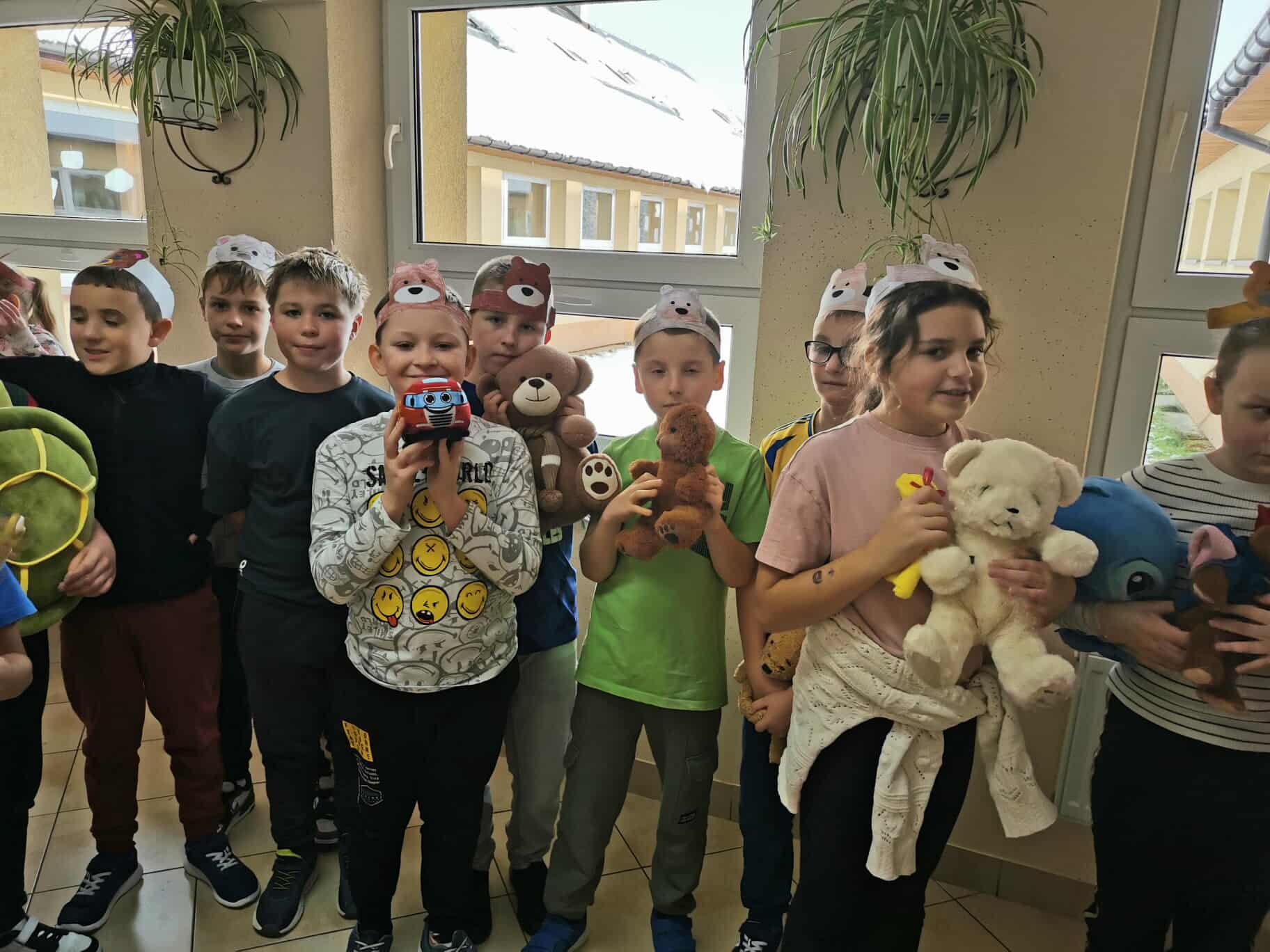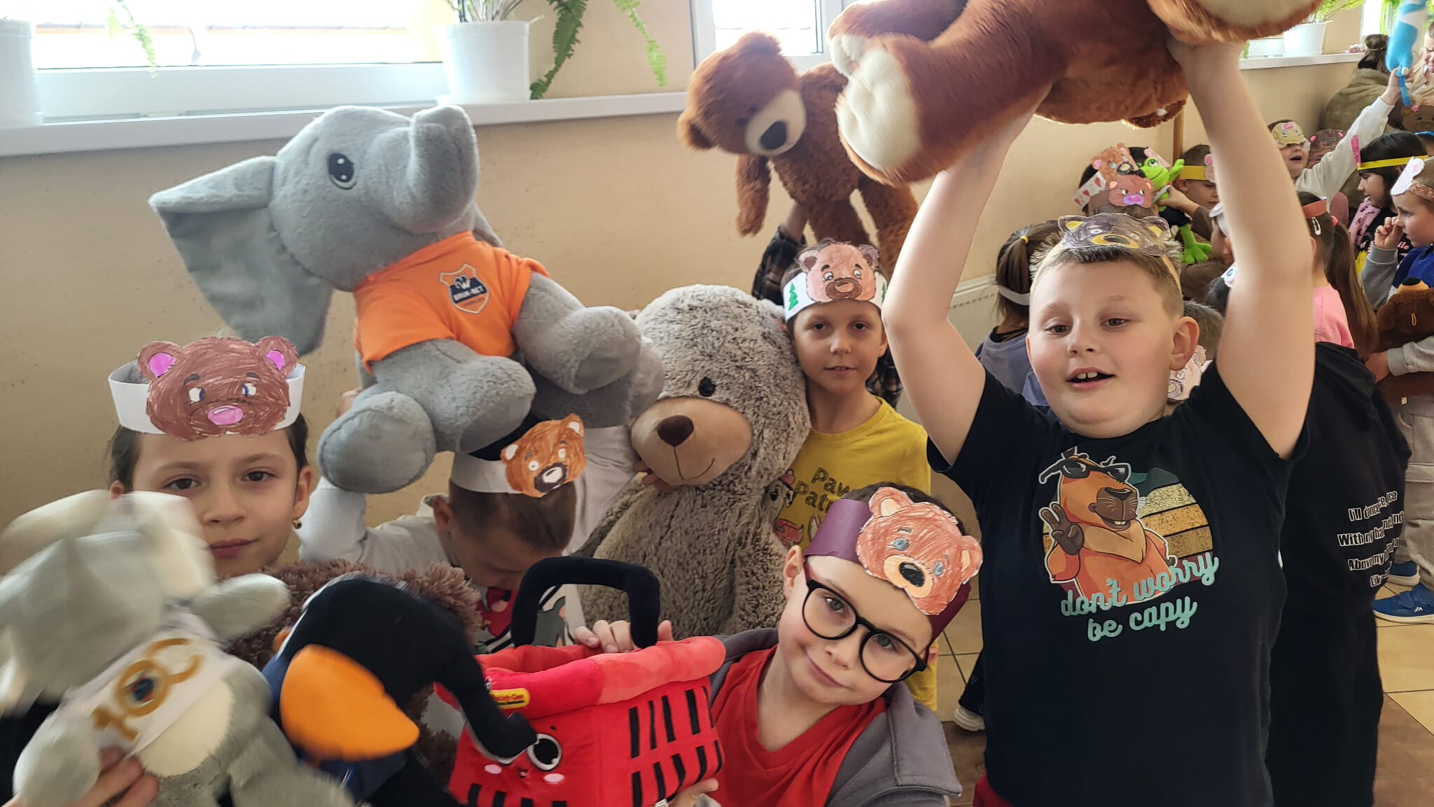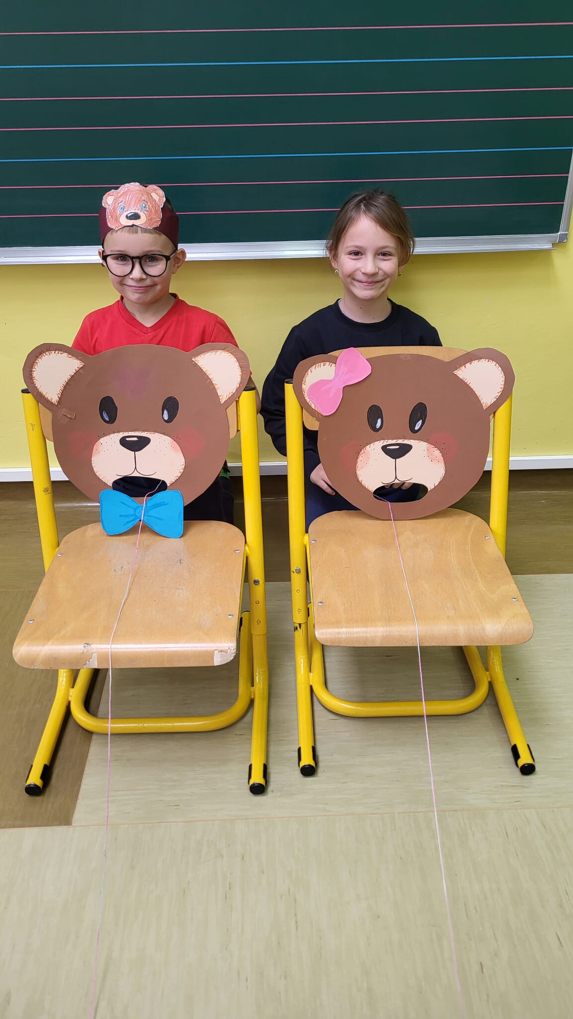 Tego szczególnego dnia uczniowie nie tylko przynieśli swoje maskotki, ale również założyli na głowy specjalne opaski, ozdobione własnoręcznie pokolorowanymi wizerunkami misiów. Dzięki temu cała społeczność szkolna mogła poczuć wyjątkowy klimat święta, a barwne opaski stały się wspaniałym akcentem podkreślającym dziecięcą kreatywność i radość.