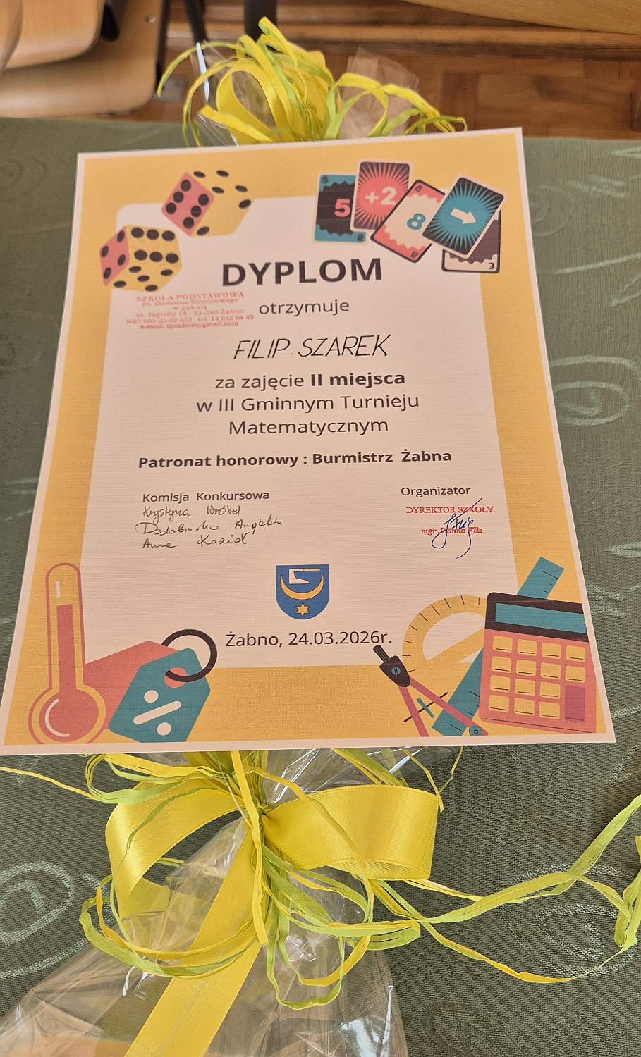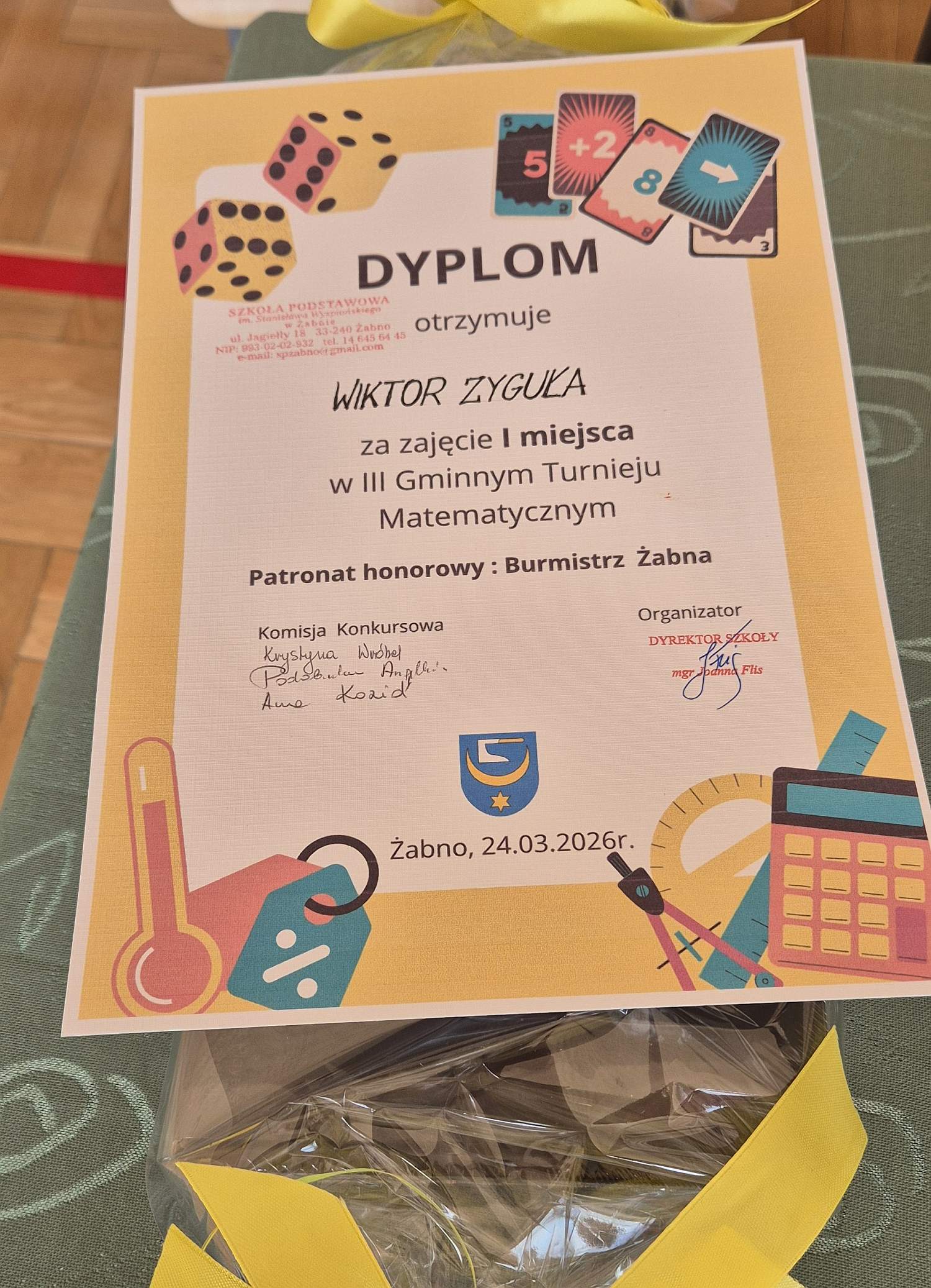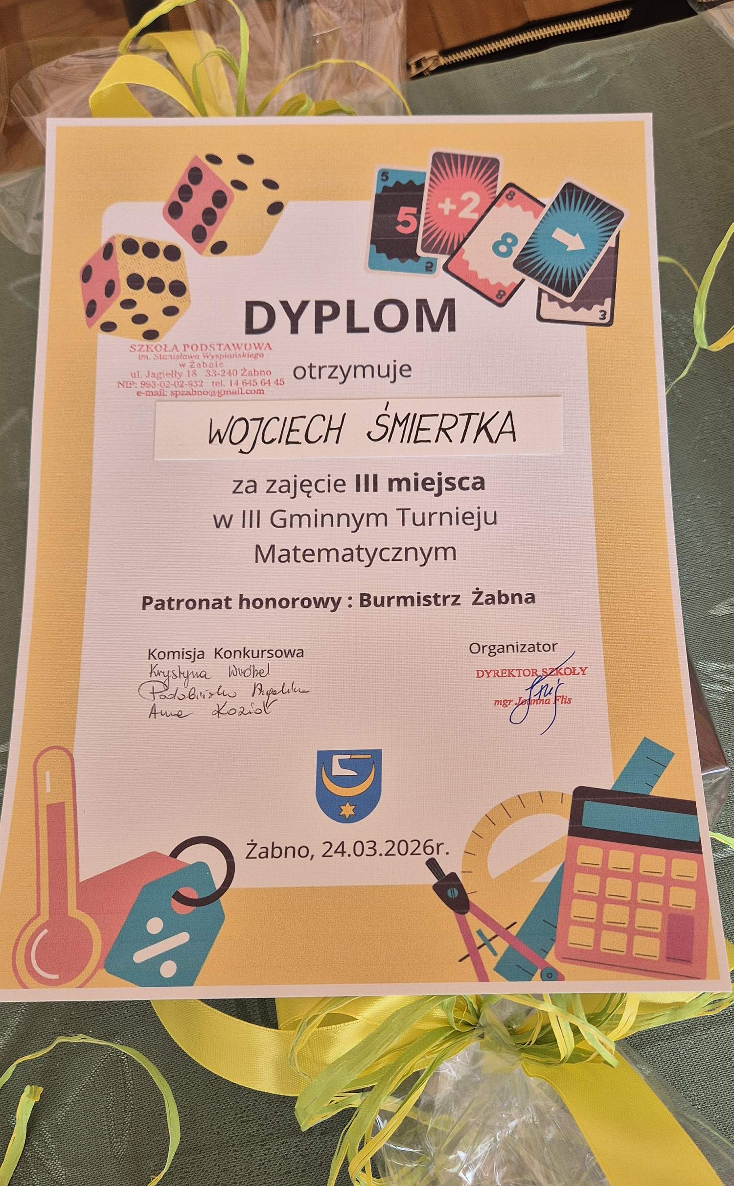 24 marca 2026 r. w Szkole Podstawowej im. Stanisława Wyspiańskiego w Żabnie odbył się III Turniej Matematyczny, organizowany pod patronatem Burmistrza Żabna. W wydarzeniu wzięli udział uczniowie szkół podstawowych z terenu gminy, którzy w pierwszym etapie, rozwiązywali zadania zamknięte i otwarte, a dziesięciu z nich, z najwyższymi wynikami, rywalizowało w drugiej części turnieju odpowiadając na pytania, w formule popularnego telewizyjnego teleturnieju „Jeden z dziesięciu”.