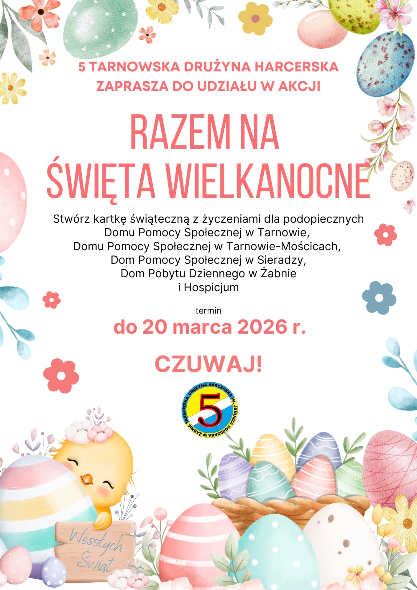 Podsumowaniem akcji „Razem na Święta Wielkanocne” i konkursu stroików wielkanocnych, zorganizowanej przez harcerzy 5TDH im. Janusza Korczaka, w której wzięli udział harcerze i uczniowie Szkoły Podstawowej z Żabna oraz przedszkolaki z Publicznego Przedszkola w Żabnie było wręczenie 400 własnoręcznie wykonanych kartek świątecznych podopiecznym Dziennego Domu Pomocy Świętej Rodziny w Żabnie, Domu Pomocy Społecznej w Tarnowie-Mościcach i Domu Pomocy Społecznej w Sieradzy. Z tej okazji harcerze przygotowali krótki występ i przekazali kartki z życzeniami świątecznymi. Był czas na wspólne śpiewanie, rozmowę i wspomnienia. Na twarzach obecnych zagościł uśmiech. Ta wizyta na długo zostanie w sercach harcerzy i pensjonariuszy.
