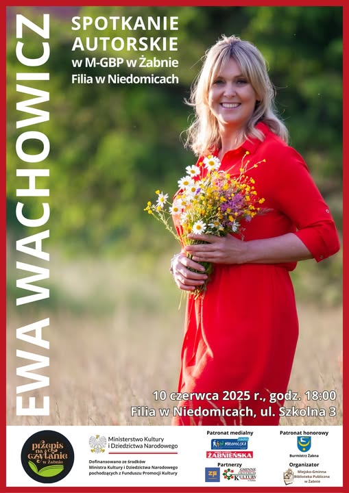 Miejsko-Gminna Biblioteka Publiczna w Żabnie zaprasza na spotkanie autorskie z Ewą Wachowicz w ramach projektu „Przepis na czytanie”, które odbędzie się 10 czerwca o godz. 18:00 w Filii w Niedomicach.