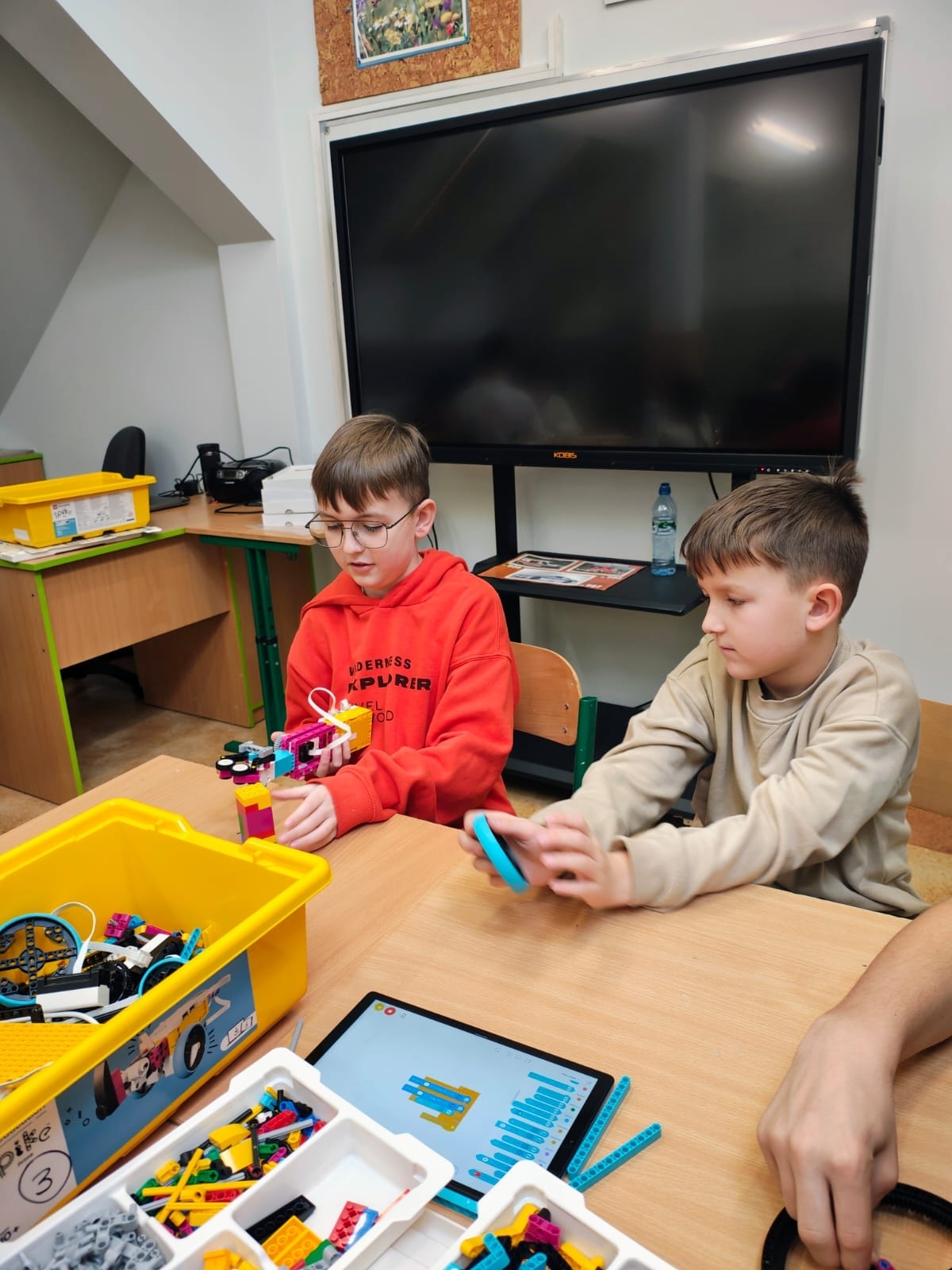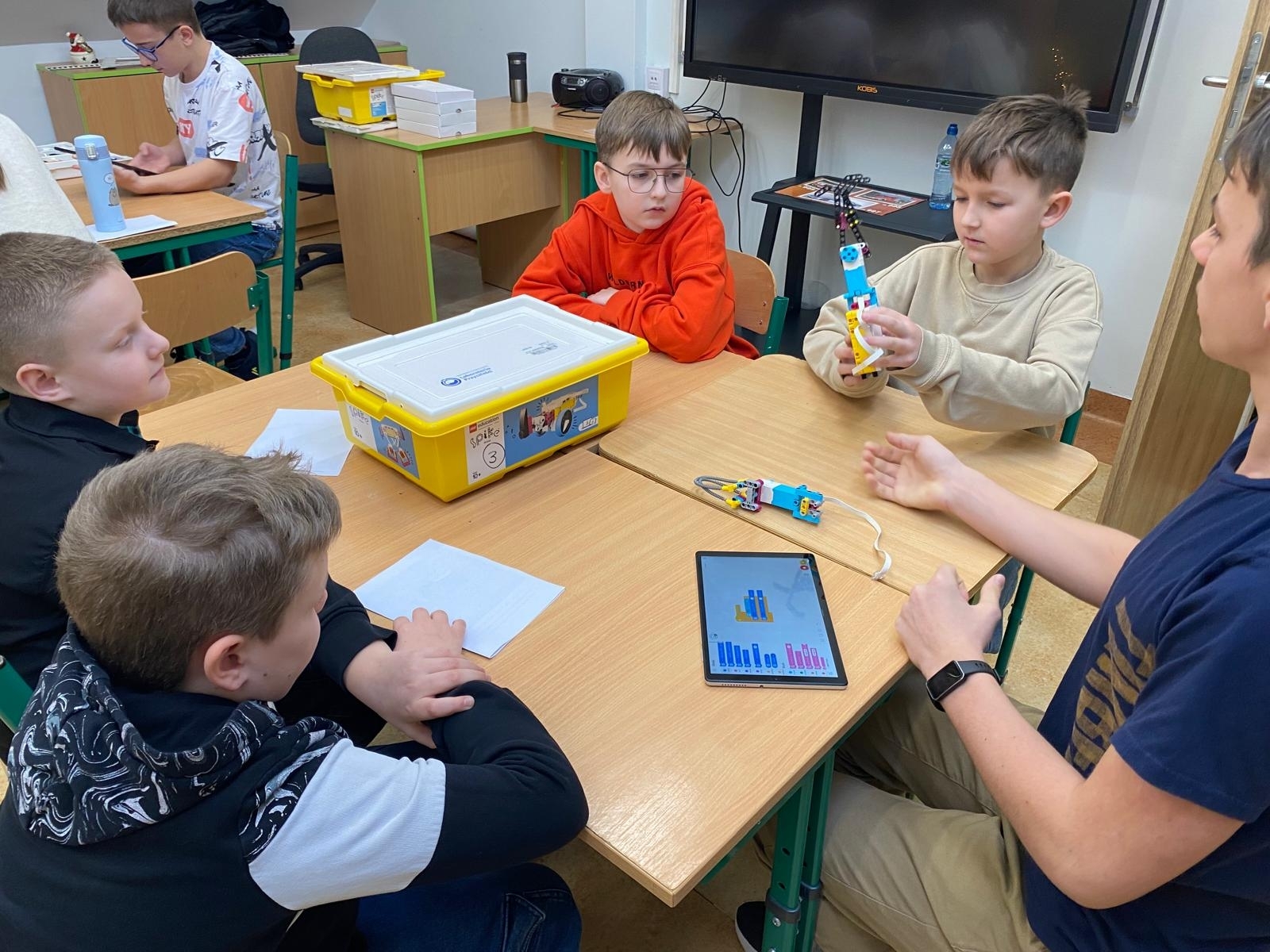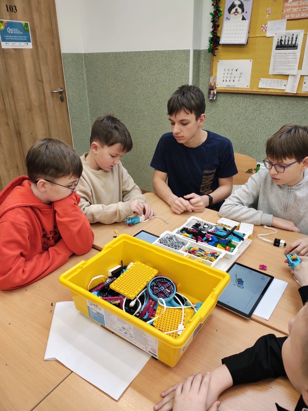W czasie oczekiwania na wyniki dzieci uczestniczyły w zajęciach edukacyjnych z robotami SPIKE, prowadzonych przez uczniów klasy VII pod opieką pani Barbary Traczyk. Uczestnicy konkursu mieli możliwość budowania i programowania robotów SPIKE oraz skorzystali z ciepłego posiłku zapewnionego przez organizatora.