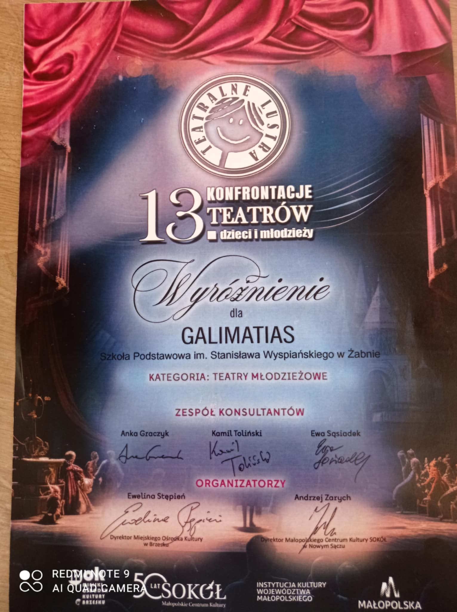 Zespół teatralny „Galimatias” oczarował publiczność podczas XIII Konfrontacji Teatrów Dzieci i Młodzieży, zdobywając wyróżnienie za spektakl „Wesele inaczej”. Barwne ludowe stroje, autentyczna weselna atmosfera i pełne werwy przyśpiewki ludowe, które rozbrzmiewały ze sceny, sprawiły, że widzowie przenieśli się w świat tradycji podanej z przymrużeniem oka. Młodzi aktorzy pokazali, że folklor może być nie tylko piękny, ale i zaskakująco nowoczesny. Wielkie brawa dla całego zespołu!